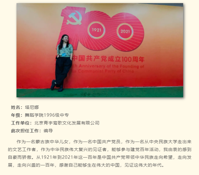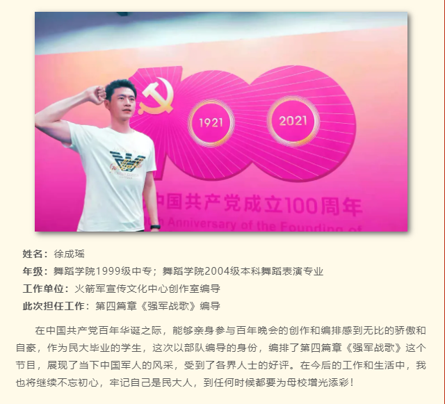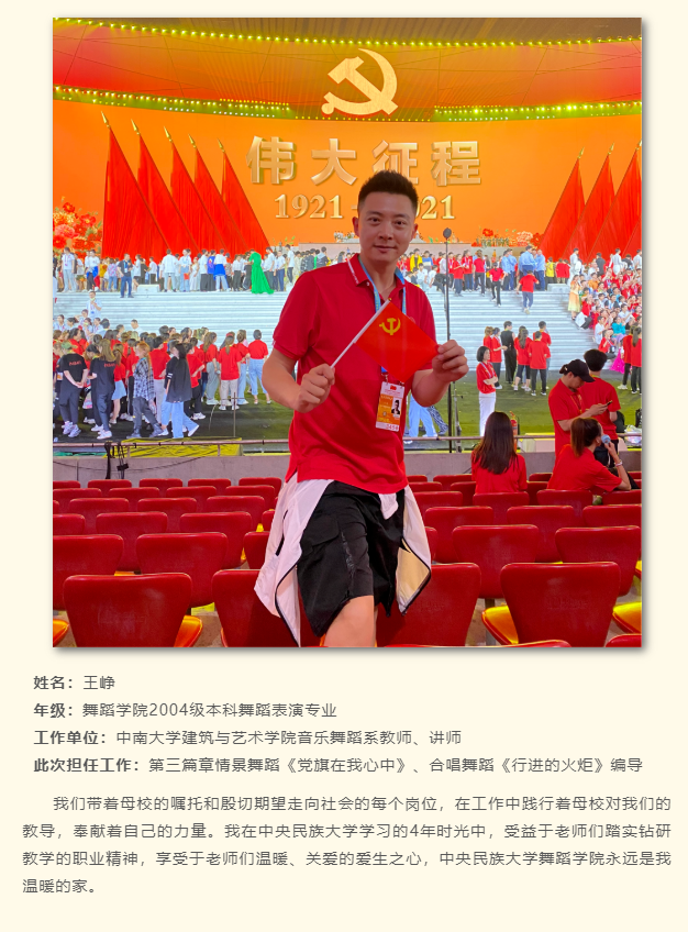 三个多月的工作,在无数次的创意会、无数次的排练、无数次的修改,无数次的呈现中,我切身感受党和人民砥砺奋进的百年。作为民大学子,我深深地感谢民大对我的培养,没有老师的谆谆教诲,也就没有今天能够参加《伟大征程》的我。