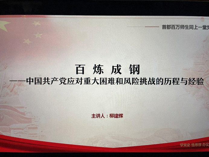 组织学生共同观看了“首都百万师生同上一堂党史课”系列网络公开课。学习的党课主题为“百炼成钢——中国共产党应对重大困难和风险挑战的历程与经验”。主讲人为中共中央党校(国家行政学院)教授、博士生导师柳建辉。