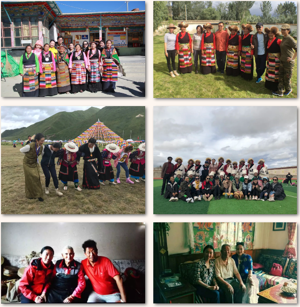 秉承知行合一的教学理念,自留校任教以来,每年的寒暑假都是在藏区度过的,已经有很多年未感受北京的盛夏了。如今已走访了五大藏区的大多数地方,深入了解藏族热巴、弦子、锅庄、依、卓、果谐、堆谐、囊玛、宣、卓果谐等舞蹈。在十几年的采风调研中,接触、收集了大量民族舞蹈一手资料,参访了众多非遗传承人。并把从乡土掌握的文化知识转换到课堂教学中,丰富“言传身教”的教学方法,使用现代化教学手段,通过线上教学给学生分享民间舞蹈视频和文本资料,与线下教学形成互补,让学生能够更加生动的感受到民族舞蹈的魅力。