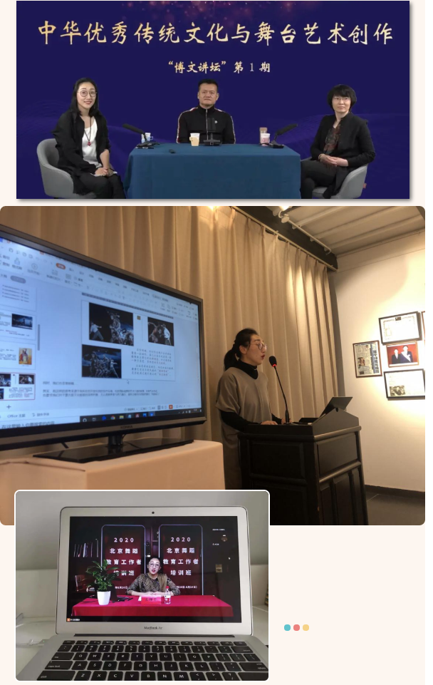 在业余时间,她致力于普及艺术领域的相关内容,参与各种艺术讲座与艺术研讨,2020年8月受北京舞蹈家协会邀请,为北京舞蹈教育工作者培训班的学员们开展了教学与创作相关的讲座。受中国文联的邀请,参与文联文艺研修院的博文讲坛等相关的文艺讲座。在此期间,她还积极投身于艺术志愿者工作当中,深入内蒙等民族地区,为弘扬中华民族优秀的传统文化献上自己的力量。2019、2020年多次受中国舞蹈家协会的邀请,她带领学生创排多部作品,参加首钢环境舞蹈展演,用沉浸式的表演方式让观众走近舞蹈艺术的氛围,受到社会各界好评如潮,积极推动了艺术工作的发展。