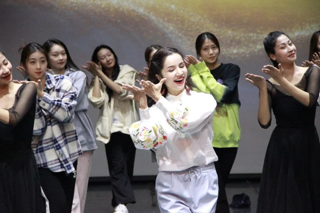 最后,古丽米娜老师以现场教学的方式,让同学们体验到这部舞剧《集市狂想曲》舞蹈片段的活力与热情,身临其境的感受到古丝绸之路上商贸往来的富庶繁盛与各民族友爱和谐、携手共舞的美好场景。