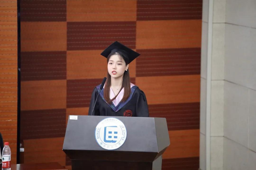 非毕业班学生代表胡斯勒祝福所有的毕业生迎着阳光,披荆斩棘,勇敢地飞向心中的梦想之地。本科生毕业生代表韦思琪、研究生毕业生代表雷雅蘭表达了对母校、对老师的深深眷恋和感激之情,同时祝愿母校永葆青春、桃李天下,同学们前程似锦。