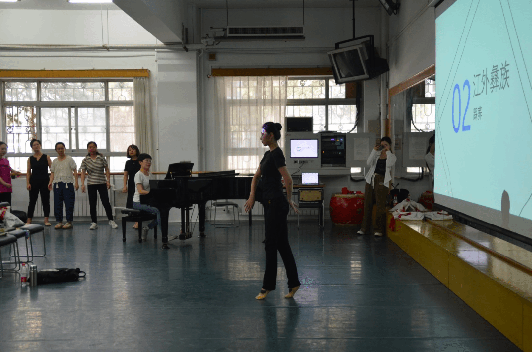 傣族板块中,刘莹老师从傣族人民温婉柔和的民族性格出发,讲授了傣族舞蹈音乐的特征,着重分析了傣族舞蹈课堂上基础性、风格性与表演性组合的不同内容,并通过弹奏向学员们示范讲解了傣族舞蹈音乐的触键方式及音乐表演力等。