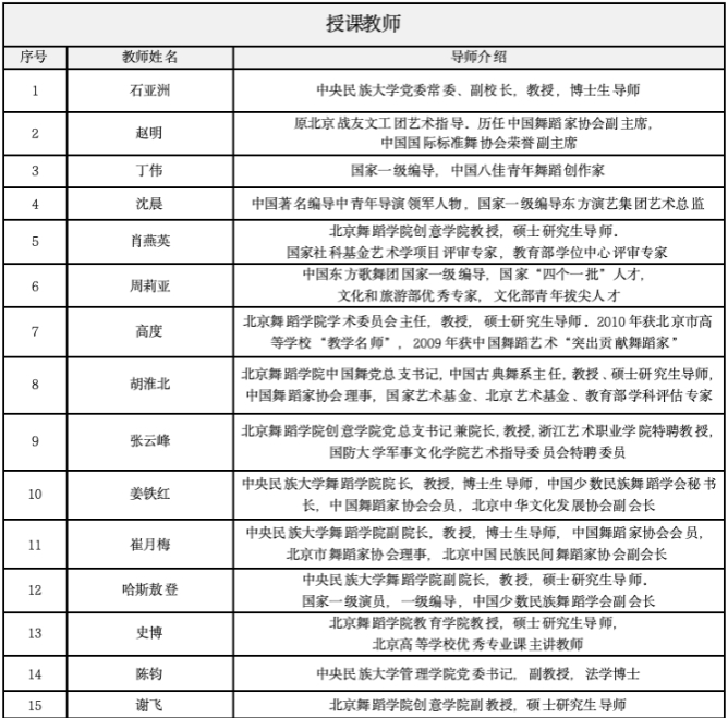 、中央民族歌舞团 、团体协会的专业师资 ,组建了由权威舞蹈理论家 、舞台导演 、舞蹈教育家 、民族舞蹈编导联手打造的强大教学团队,致力于培养高质量的民族舞蹈创意开发编导专业人才。