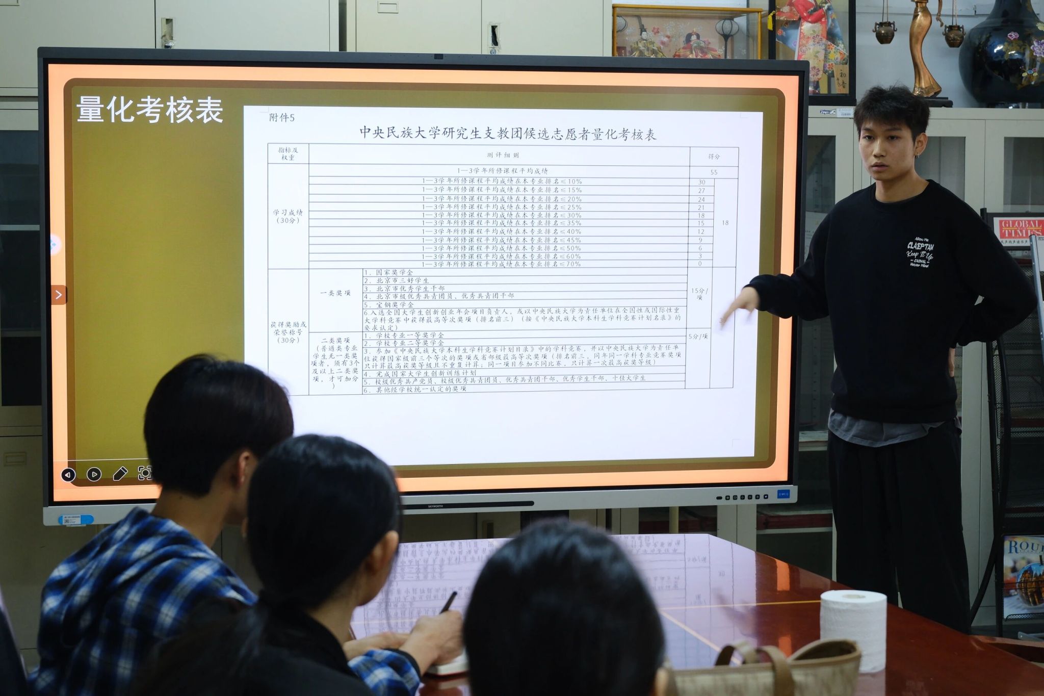 第26届研究生支教团张明慧同学首先结合一年支教实践,强调了志愿服务积累与学业成绩、外语水平等硬性指标的重要性,鼓励同学们将短期准备与长期成长相结合,为支教工作与个人发展筑牢基础。随后,第28届研究生支教团姚勤政同学系统解读了本年度评选政策,详细剖析了量化评分表中专业排名、奖项积分与志愿时长等关键指标,并重点阐释了“3分钟模拟课堂”的面试考核要点,为同学们厘清了具体准备方向。