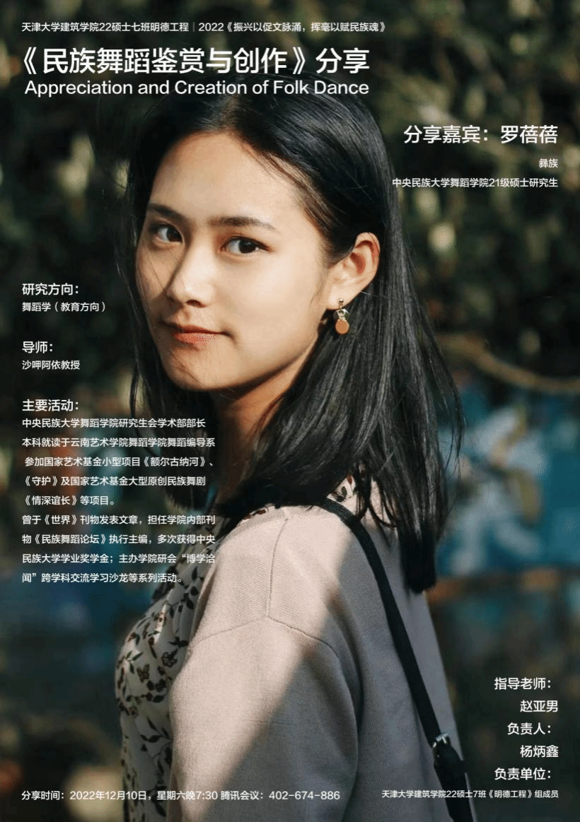 研究生会学术部部长罗蓓蓓,以民族舞蹈作品赏析和研究创作方法分享为主题,开展跨学科艺术鉴赏、交流学习,共同探讨民族艺术——民族舞蹈的“真善美”。
