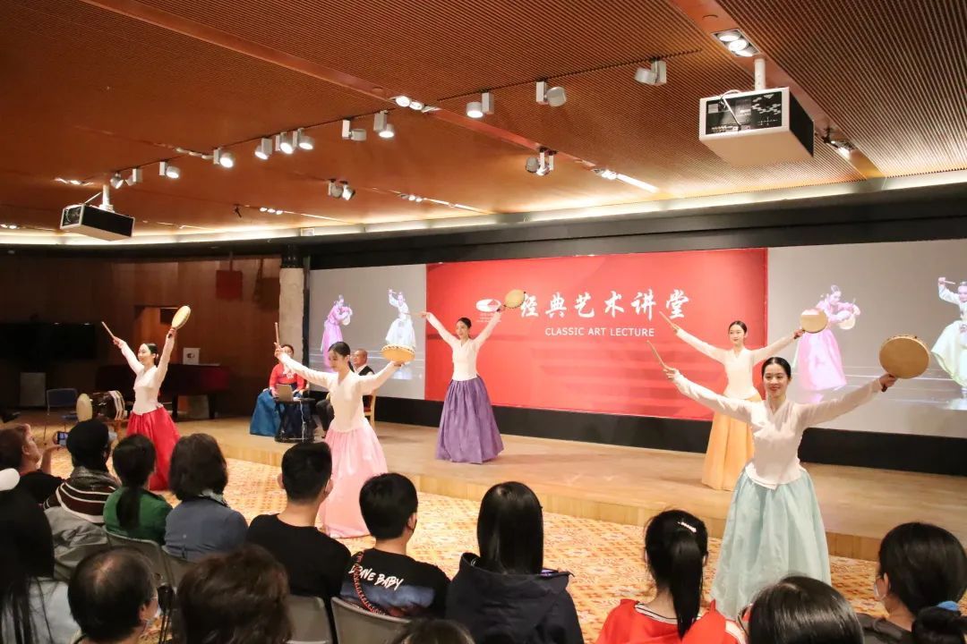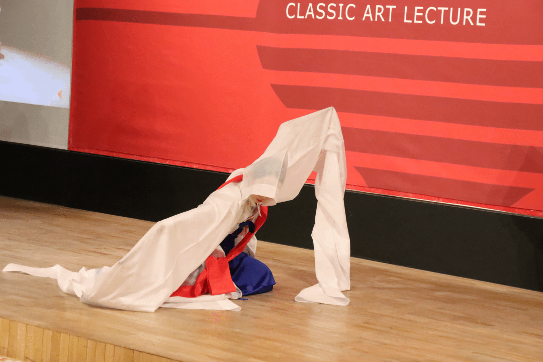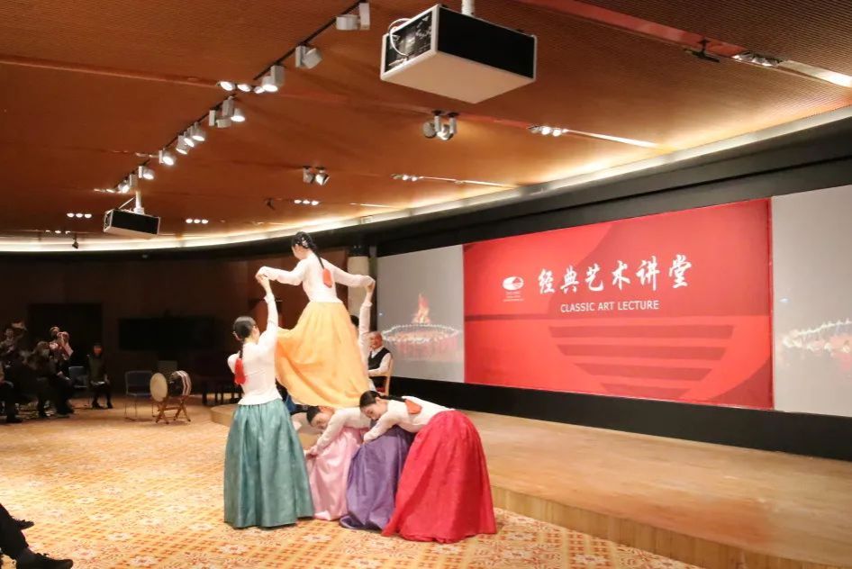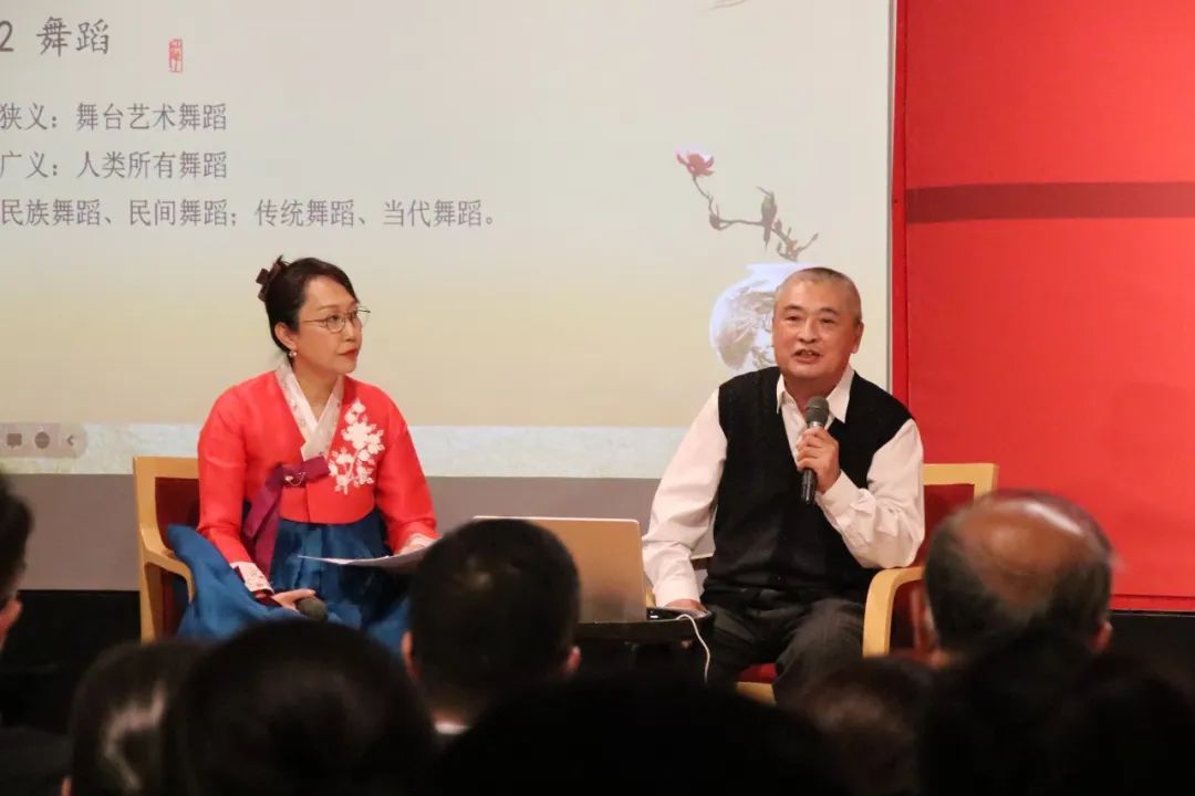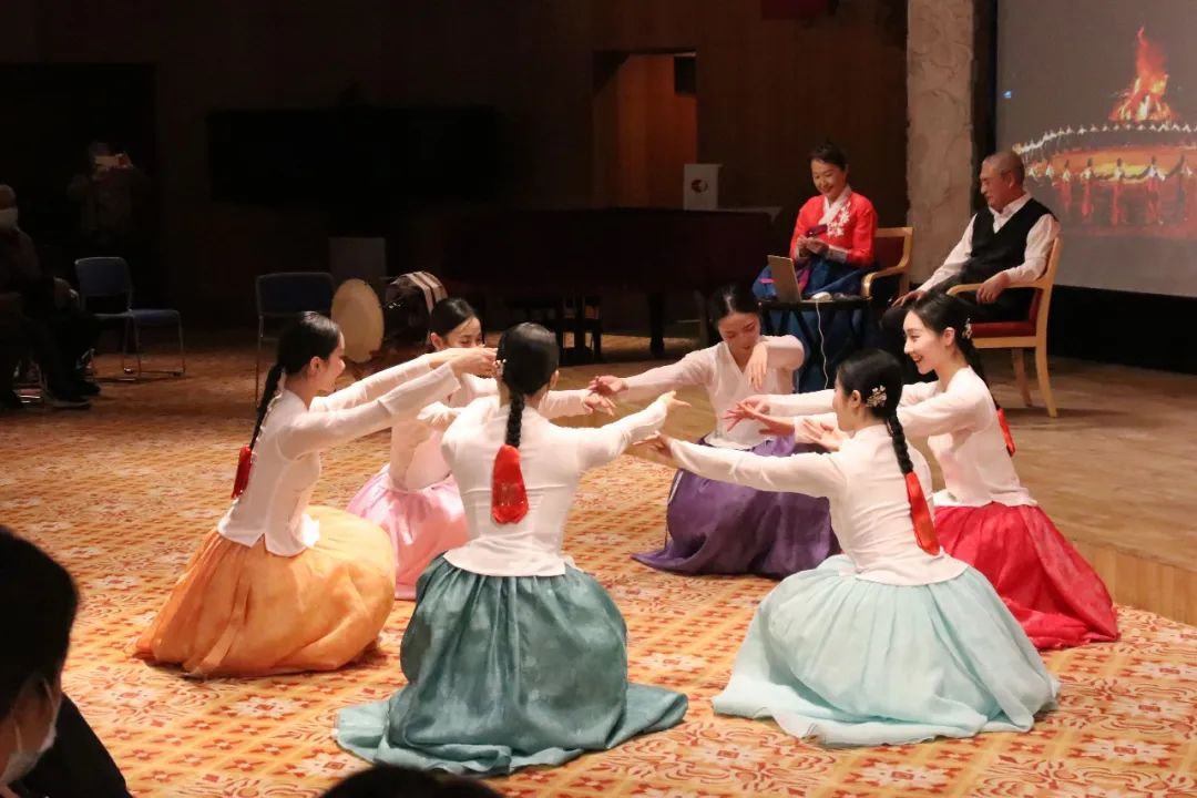 崔月梅教授的硕士生进行了朝鲜族长鼓舞表演,引起了现场观众的学习热情。接下来,朴永光教授介绍了“民族”与“舞蹈”的概念,并为大家细致讲解了民族舞蹈与民间舞蹈、传统舞蹈与当代舞蹈的区别。朴永光教授与崔月梅教授以朝鲜族的发展历史为出发点,从生产民俗、生活民俗、精神民俗三个方面进行了朝鲜族民俗文化讲解,使观众对朝鲜族舞蹈文化有了较为全面的了解。